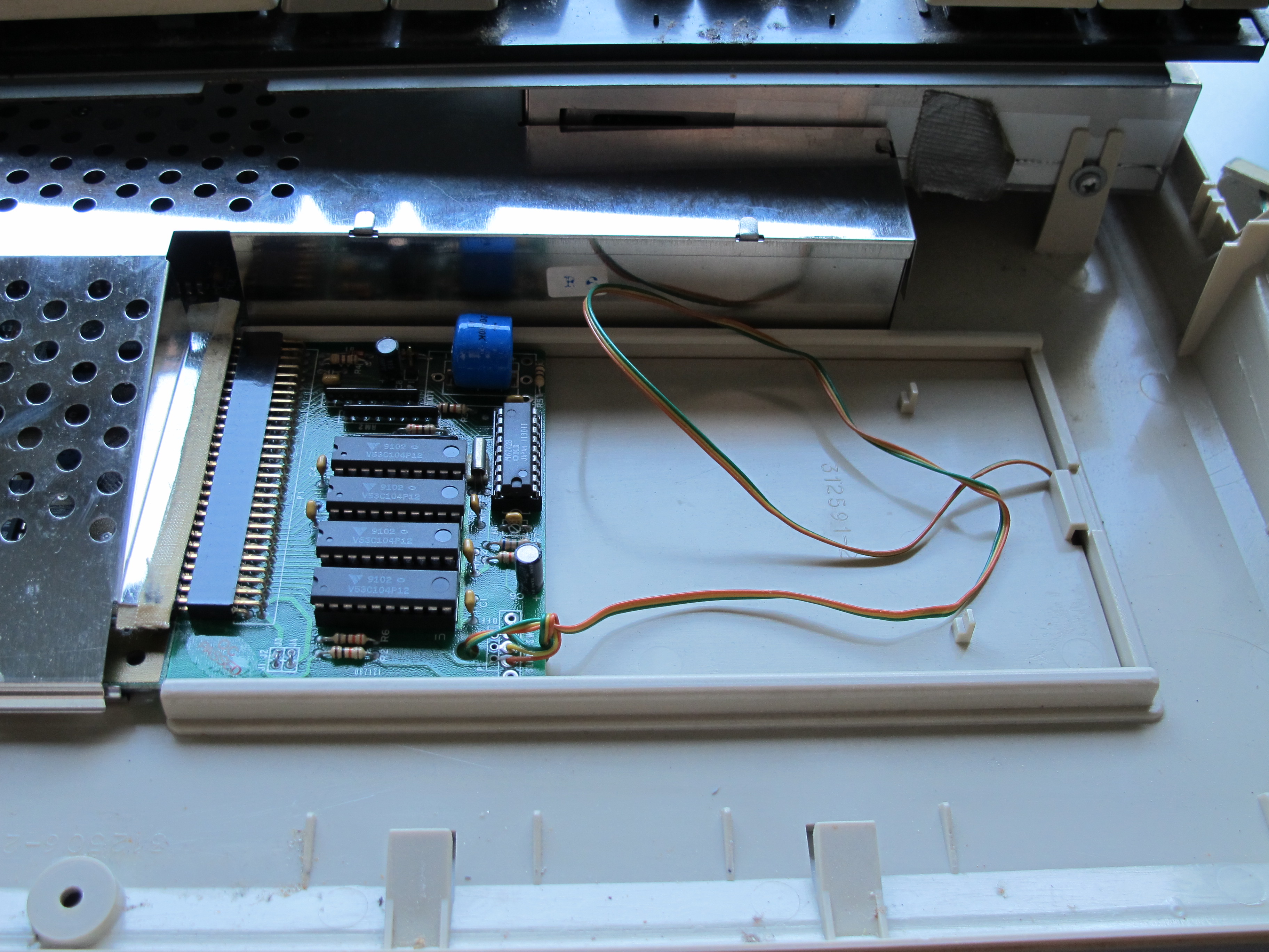 Näppäimisto irroitettu ja alta paljastuu jo pohjasta käsin asennettu lisämuisti ja siitä lähtevä piuha valintakytkimelle.