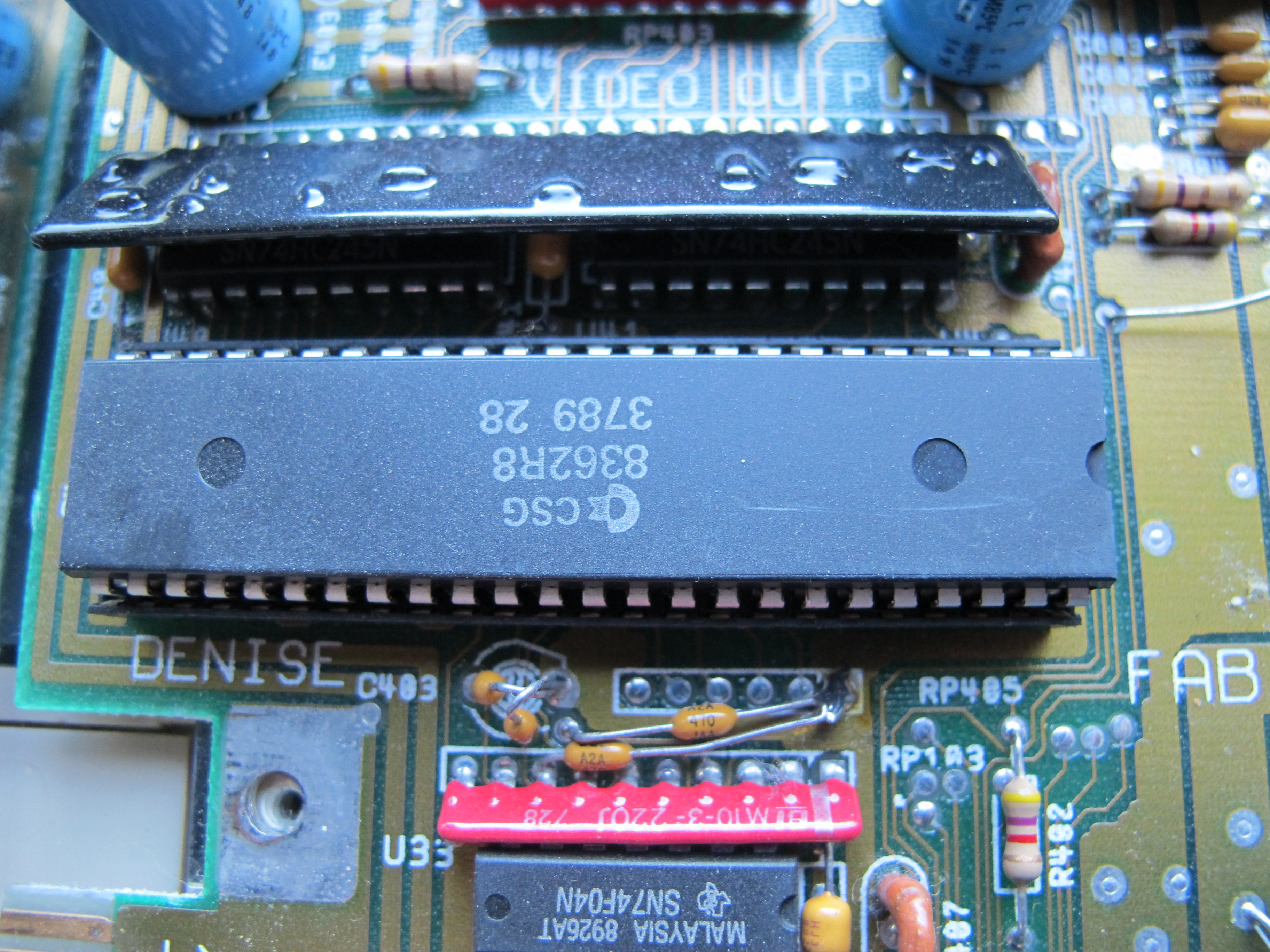 Denise vielä lähikuvassa. Pintaliitoskomponenteista voi päätellä että piirilevy ei ole ihan tätä päivää.