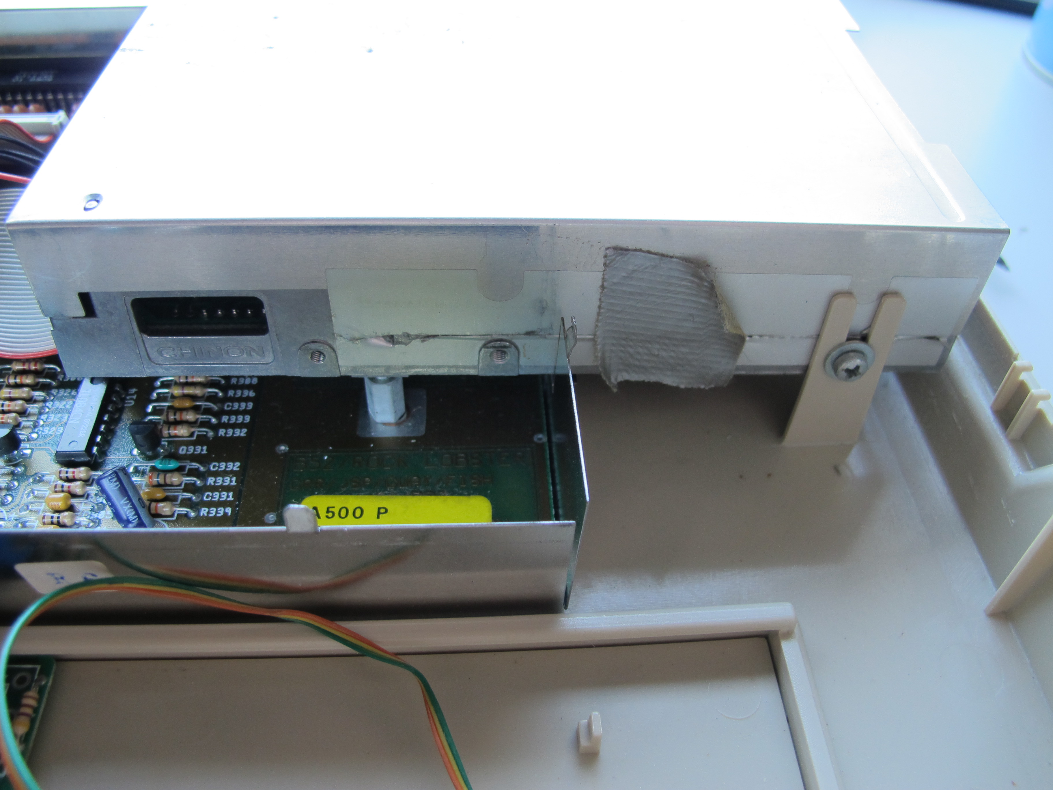 Korppuaseman kiinnitys. Pala jesaria(?) kertoo että edellinen omistaja on avannut laitteen jossain kohtaa.